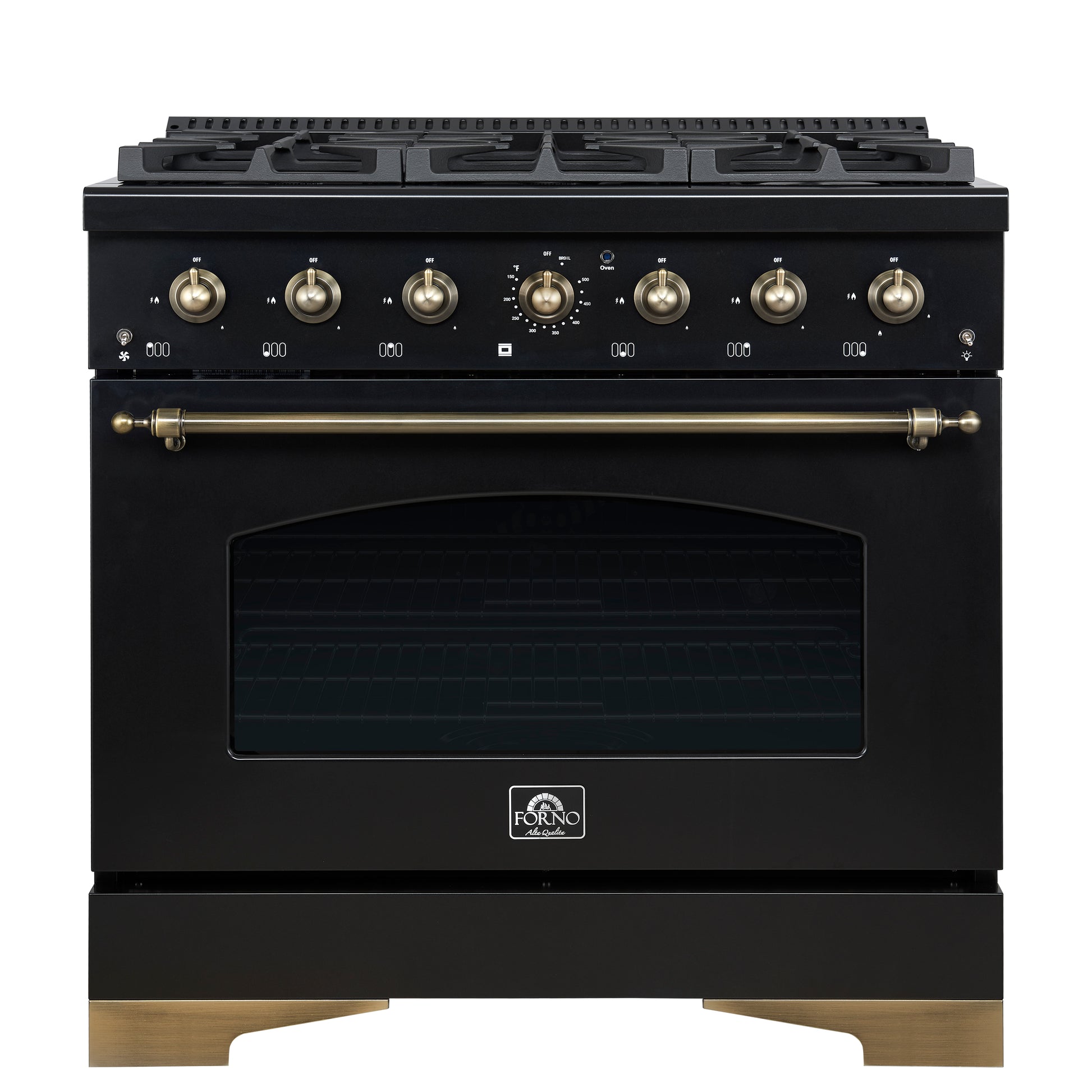 Elevate your kitchen with the stylish and high-performance Forno Antico 36" Gas Range in black, designed to bring elegance, functionality and affordability to your home. With 6 sealed burners and a total output of 71,000 BTU, it delivers the power and precision needed for any culinary challenge. The dual-ring brass burner offers up to 20,000 BTU for high-heat searing and 1,000 BTU for simmering, providing exceptional control. Its spacious 4.5 cu. ft. convection oven ensure even baking and roasting. With its elegant black finish and antique brass accents, the Antico exudes sophistication, while the cast-iron grates provide lasting stability and durability. The recessed enamel cooktop makes cleanup a breeze, combining style with practicality. Whether you're preparing a weeknight dinner or hosting a dinner party, the Antico offers the versatility and power to handle it all, while enhancing the beauty of your kitchen.