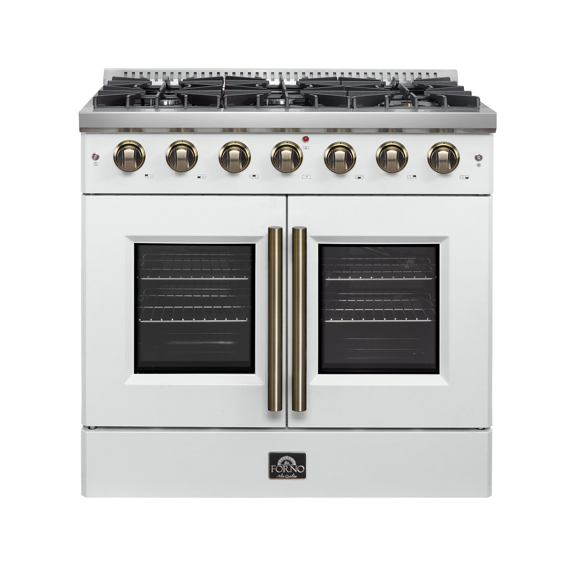 The Forno Galiano 36" French Door Gas Range in white brings professional styling and performance into your home kitchen at an affordable price. Enjoy effortless access to your oven with French doors that offer an extra 12 inches of space. The cooking surface has six sealed burners with a total output of 83,000 BTU - one of which is a 20,000 BTU dual-ring burner that can reach a precise simmer of 1,000 BTU. Cast iron grates ensure stability over the cooktop, making spills easy to clean. With a powerful 30,000 BTU output, the 5.36 cu. ft. oven features a sleek black enamel interior and a convection fan for quick, precise cooking. The 3-layer glass oven door lets you effortlessly monitor your meals. Zinc-coated metal knobs with bezel rings are built to stay beautiful for years, adding a touch of lasting elegance to your kitchen. Two electroplated oven racks and an LP conversion kit are included.