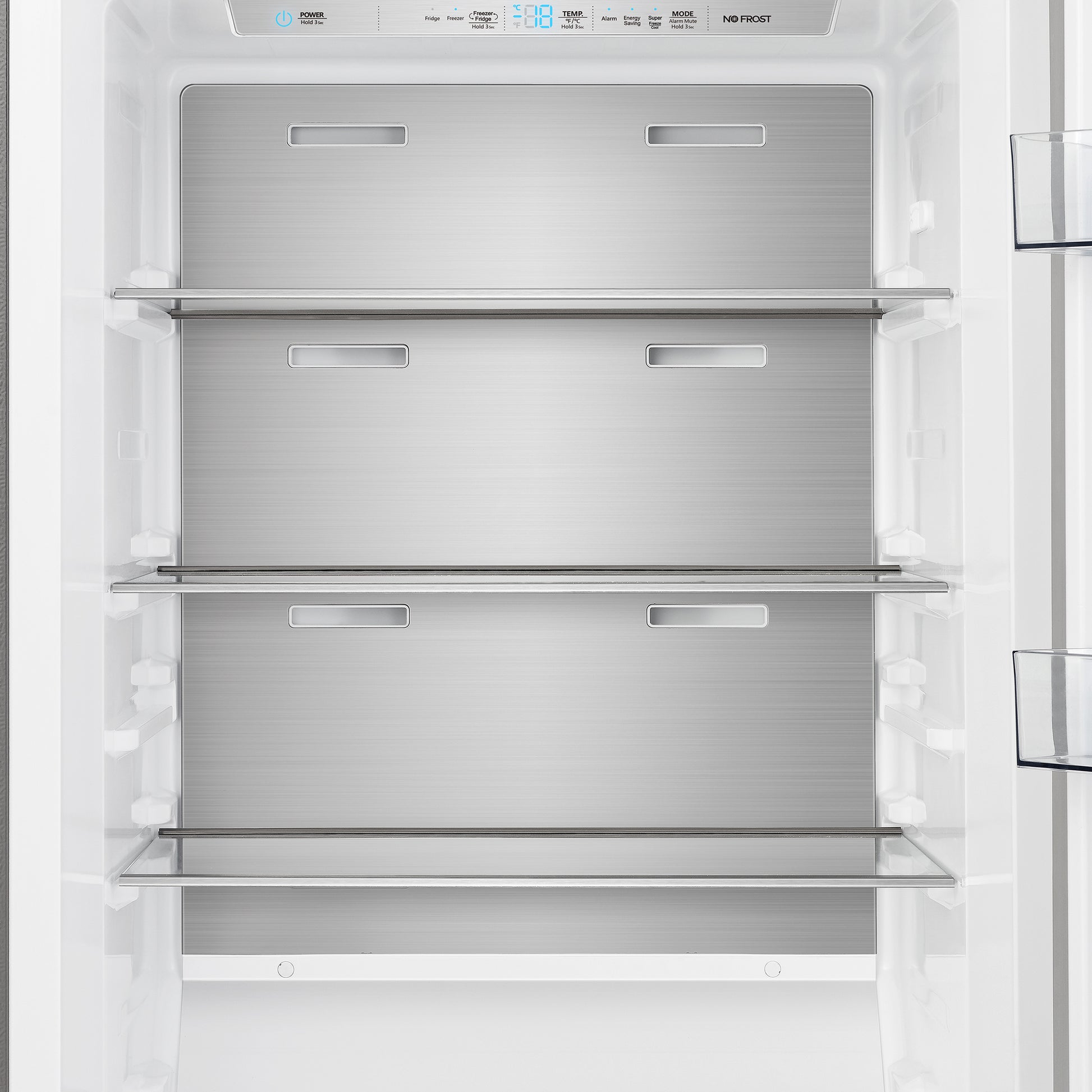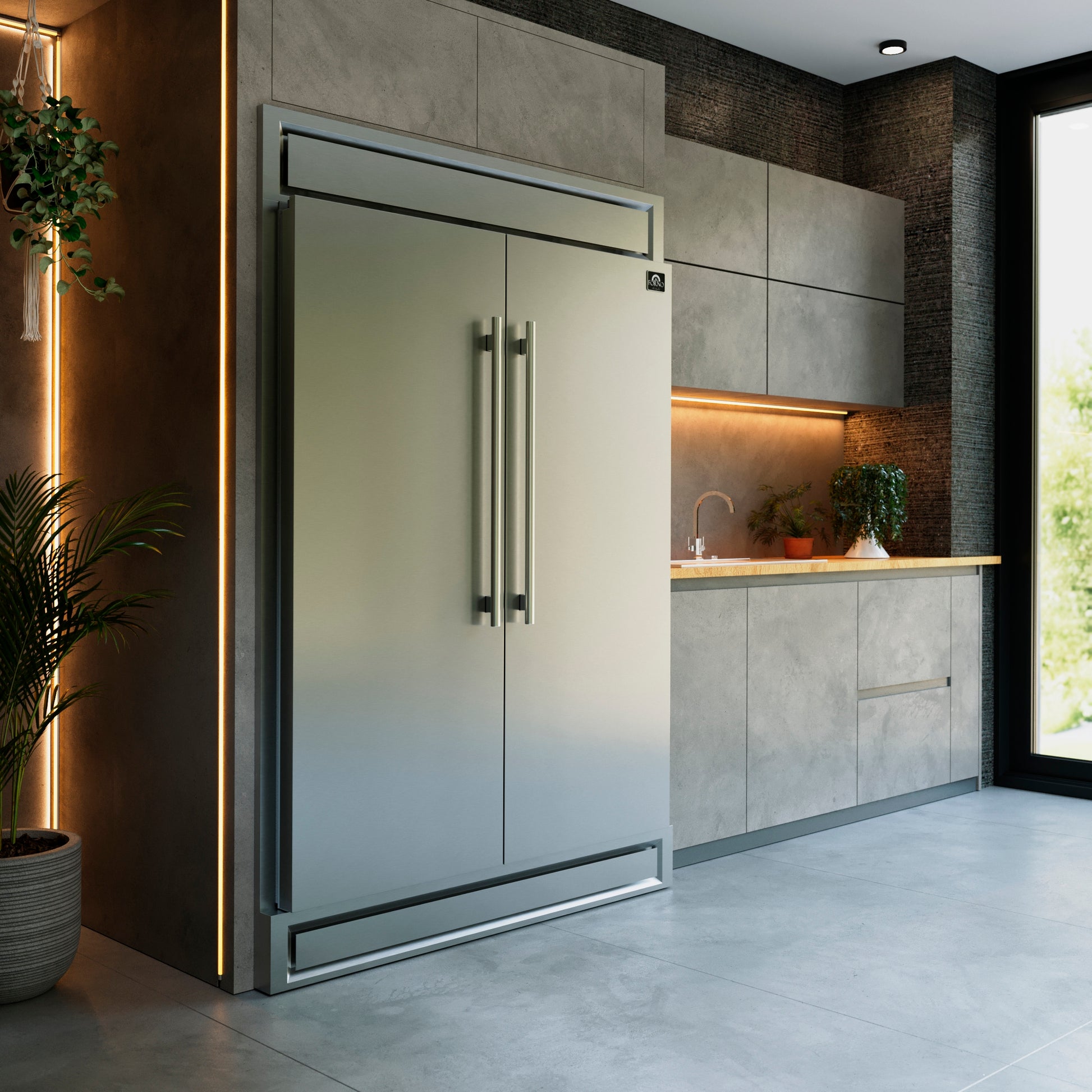 The Forno Maderno combines two 28 Inch refrigerators with decorative trim grill, extending to a 60 Inch width for a built-in appearance, harmoniously blending style with convenience. This combo offers ample storage space totaling 27.2 cu.ft. They feature customizable cooling with convertible function and total no frost technology, eliminating tedious defrosting. The side-by-side door design integrates seamlessly, while elegant glass shelves with silver trim and practical plastic door balconies enhance appeal and storage. Effortlessly switch between Fahrenheit and Celsius, aided by LED lighting for easy item location. Six glass shelves and six plastic drawers with silver trim provide flexible storage, and temperature settings are easily managed with the electronic touch control panel. The VCM door panel and metal back ensure durability, and the combo is T Climate Class certified with an E-star energy rating for sustainability.