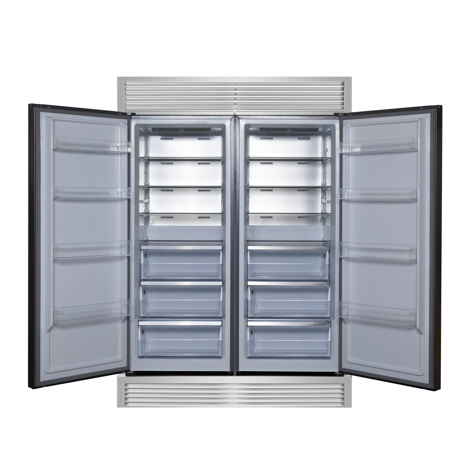 The Forno Maderno offers a premium 60-inch built-in refrigerator look by combining two 28-inch refrigerators with a trim kit for seamless integration. With 27.2 cu.ft. of total capacity, it delivers generous storage and features Convertible Cooling Zones, Total No-Frost Technology, and a refined control panel. Six glass shelves with silver trims, 6 drawers, and LED lighting enhance both organization and visibility. The VCM doors and metal back panel ensure long-lasting durability, while the Energy Star Certification guarantees sustainability.