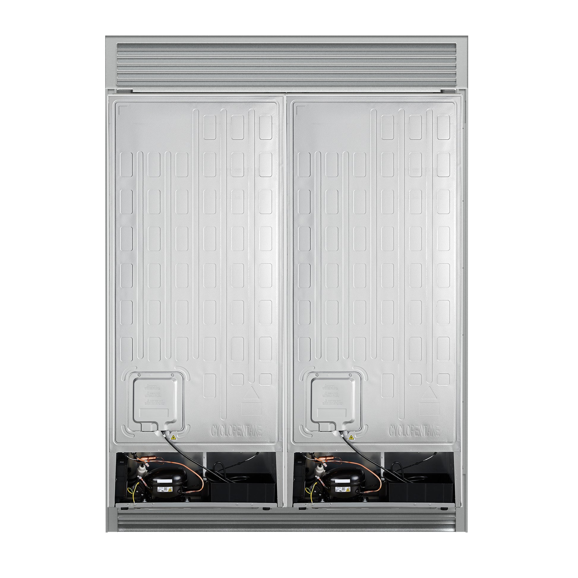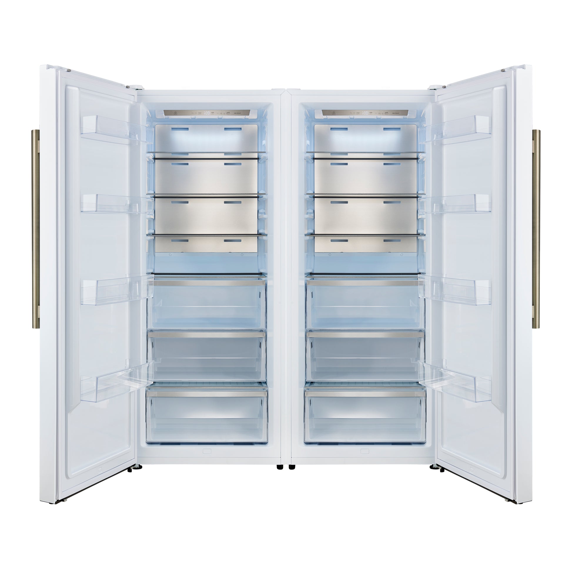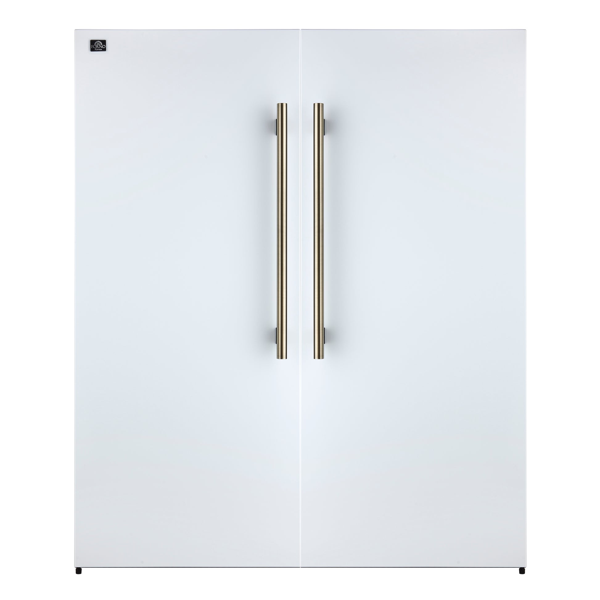 The Forno Maderno offers a premium 60-inch built-in refrigerator look by combining two 28-inch refrigerators with a trim kit for seamless integration. Available in white and featuring antique brass handles, it’s part of our elegant Espresso line. With 27.2 cu.ft. of total capacity, it delivers generous storage and features Convertible Cooling Zones, Total No-Frost Technology, and a refined control panel. Six glass shelves with silver trims, 6 drawers, and LED lighting enhance both organization and visibility. The VCM doors and metal back panel ensure long-lasting durability, while the Energy Star Certification guarantees sustainability.