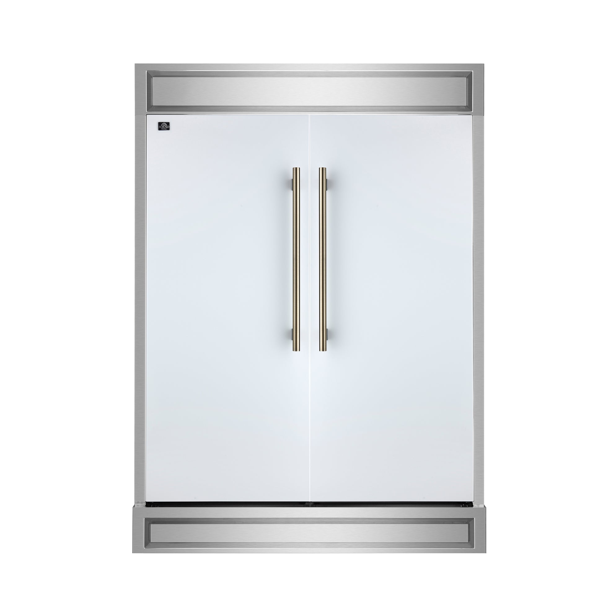 The Forno Maderno offers a premium 60-inch built-in refrigerator look by combining two 28-inch refrigerators with a trim kit for seamless integration. Available in white and featuring antique brass handles, it’s part of our elegant Espresso line. With 27.2 cu.ft. of total capacity, it delivers generous storage and features Convertible Cooling Zones, Total No-Frost Technology, and a refined control panel. Six glass shelves with silver trims, 6 drawers, and LED lighting enhance both organization and visibility. The VCM doors and metal back panel ensure long-lasting durability, while the Energy Star Certification guarantees sustainability.